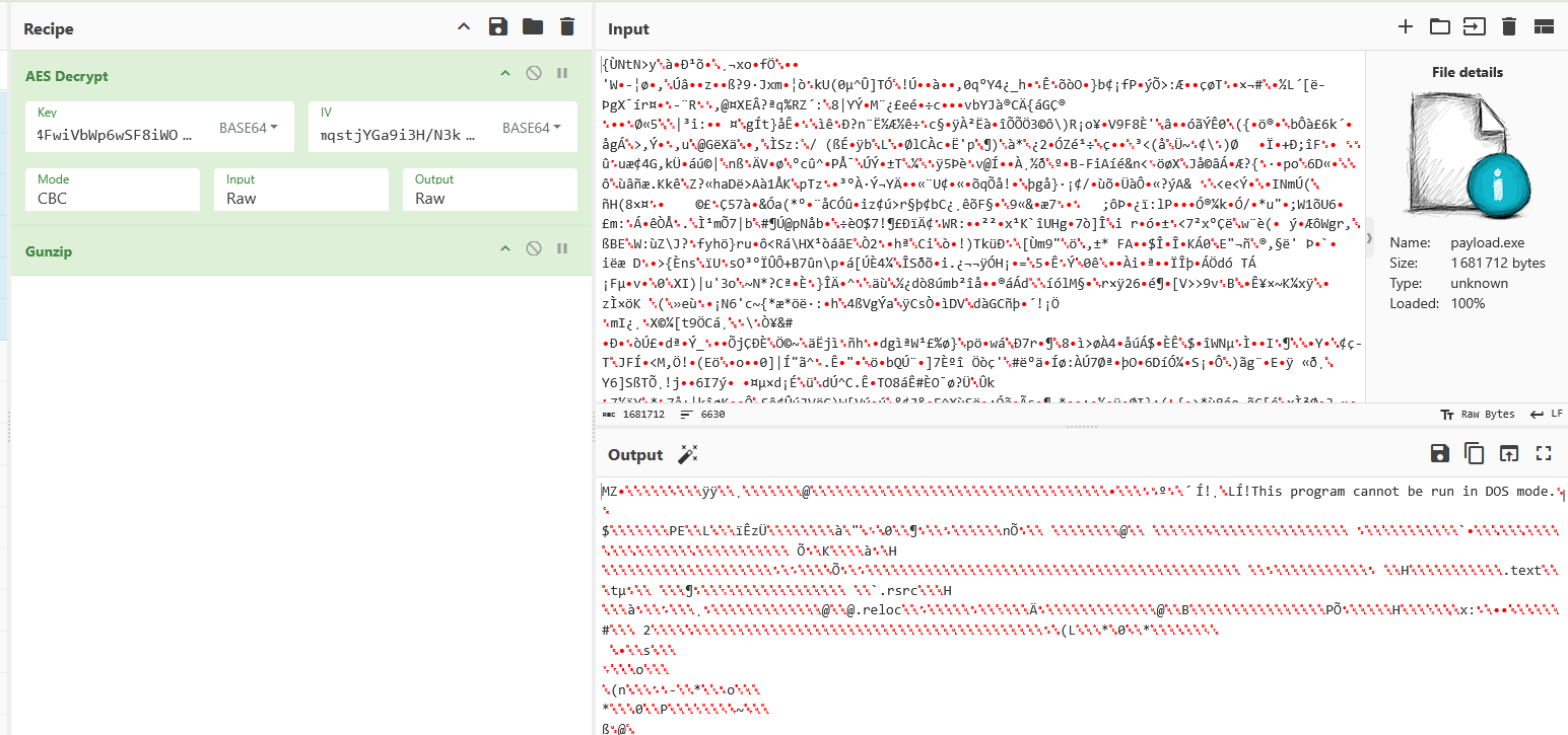 Ressource "payload.exe" → AES Decrypt → GZIP Uncompress → Assembly .NET → Execution